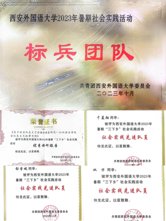 团队根据学校和学院外语专业特色,统筹安排、精心策划,为同学们量身打造具有专业特色的社会实践活动以及科研或创新项目。团队成员分工合作,积极参与项目转化,成功获批陕西省社科普及资助项目全国大学生创新创业训练项目等项目,并在大学生暑期社会实践活动中取得了优异成绩,项目组成员将在前期工作基础上,继续打造新的项目,做好成果转化,持续传承和发扬延安红色文艺精神,促进文化传承与发展。