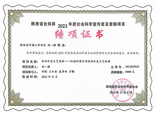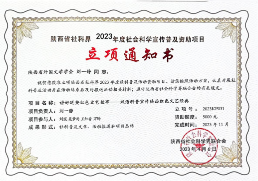 经过前期酝酿,项目于2023年4月获批2023年度陕西省社科普及资助项目(项目编号:2023KP031),并以顺利结项。项目通过科普宣传延安红色文艺经典,帮助青年学生探索外语技能运用的基础上,深入了解延安红色文化的历史和内涵,从而增强文化自信,培养其爱国主义精神。