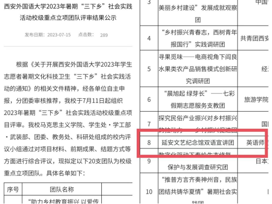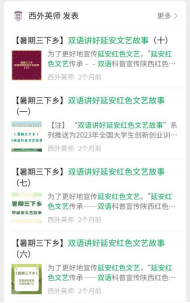 3 | 【暑期三下乡】延安文艺纪念馆双语宣讲队临时团支部主题团日活动顺利开展! | 西外英师公众号 | 7月25日 | 169 |