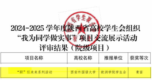 近日,由共青团陕西省委员会指导,陕西省学生联合会主办的2024-2025学年度陕西省高校学生会组织“我为同学做实事”项目交流展示活动已落下帷幕 mk体育app下载,在全省47所高校的110个服务项目中,欧洲学院学生会组织的“职引未来系列活动”获评优秀示范项目,同时获得优秀示范项目的还有校研究生会mk体育“学霸帮帮团”和校学生会“生”音乐驿站一站式学生会服务站。
