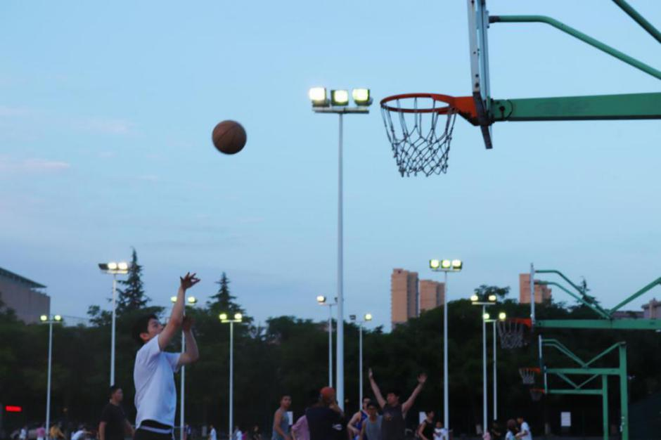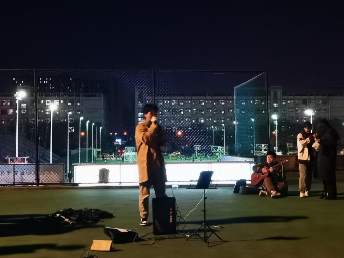 大家围坐在操场上一起唱歌听歌,看月色笼罩大地,远处时不时传来欢呼声...路灯把黑夜烫了个洞,我们的影子在草坪上绣了朵花。