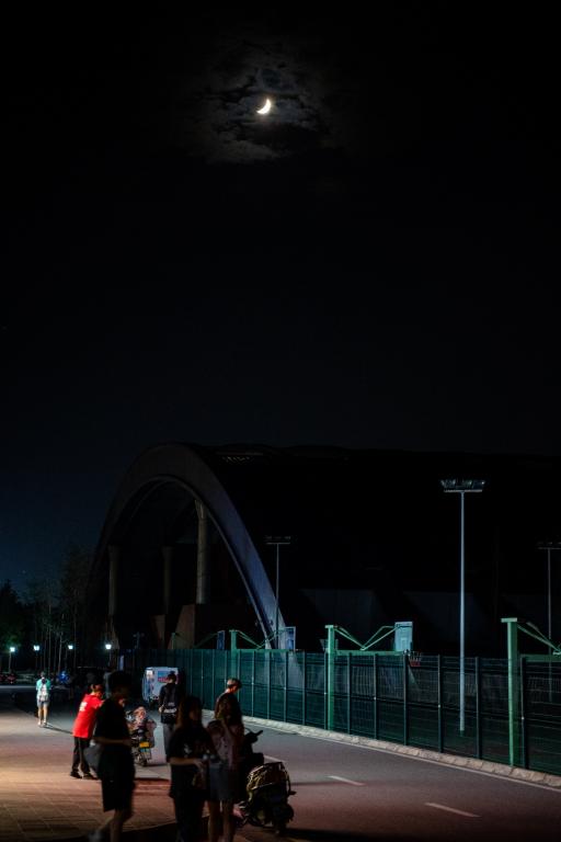 夜晚从图书馆返回的同学为月亮停下了脚步