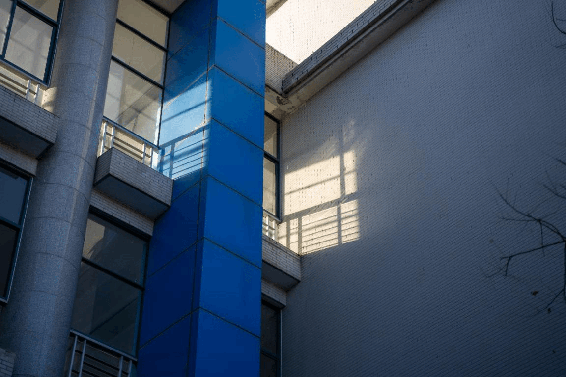 早晨的光穿过教学楼之间的长廊