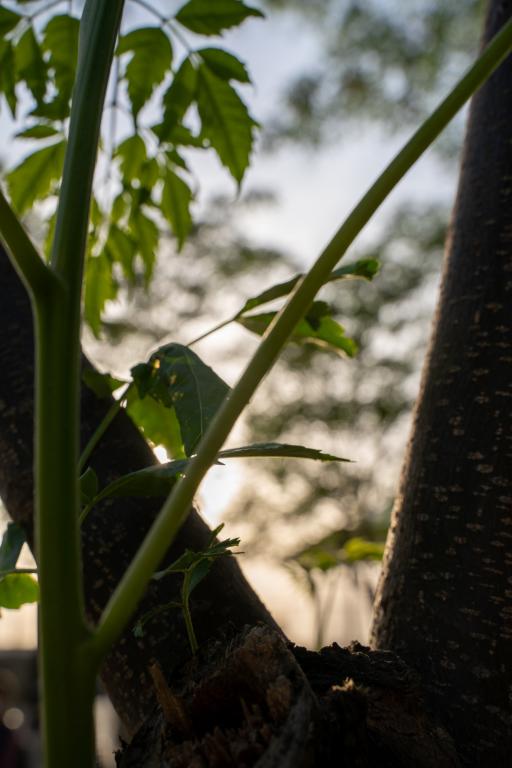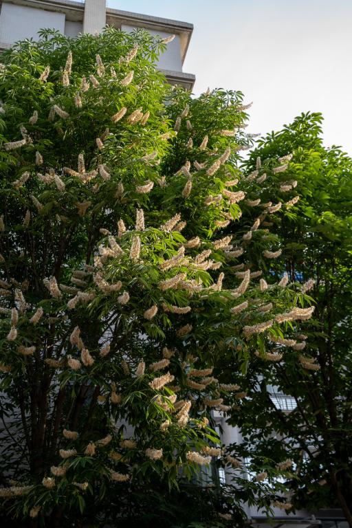 早晨实验楼门口的七叶树,阳光洒下