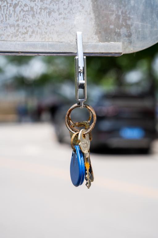 路边路牌上用铁勾挂着的一串钥匙