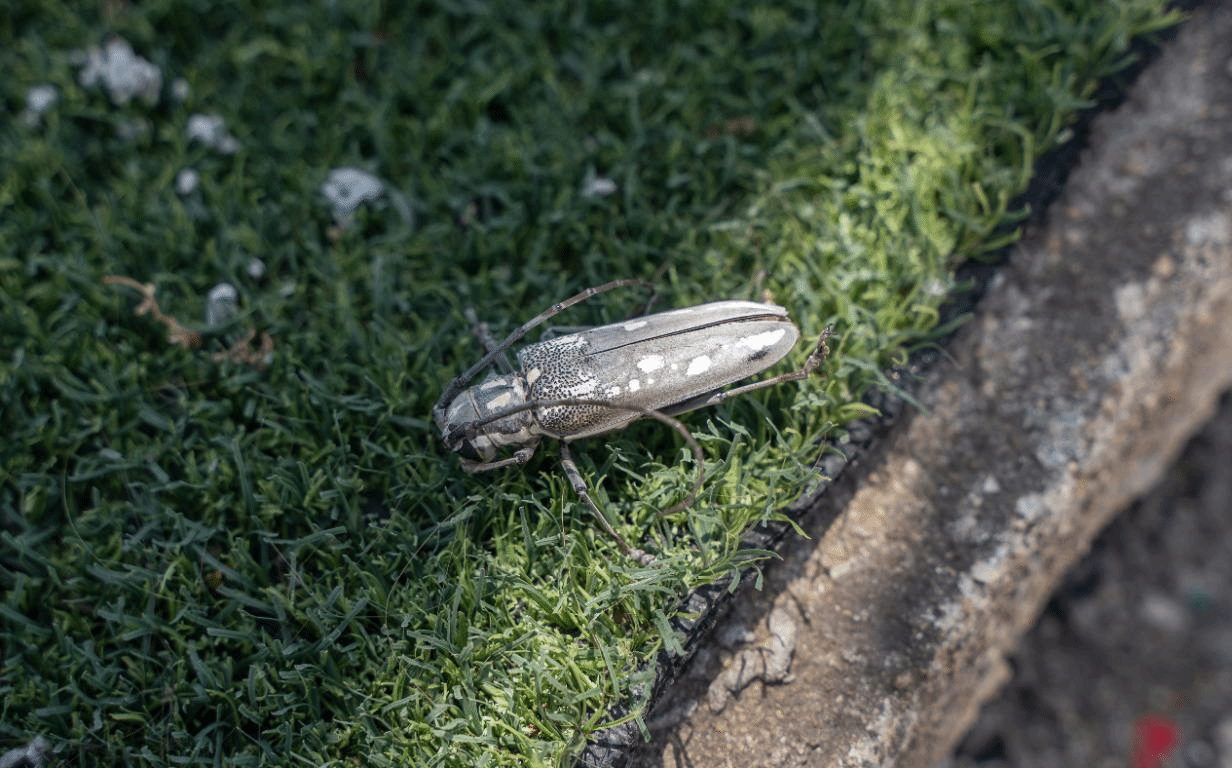 篮球场边,一只天牛缓慢地爬着